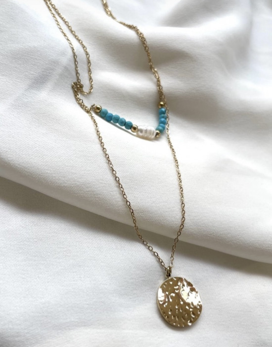 Collier double en acier inoxydable perle blanches et bleues .Doré .Résiste à l'eau .Ne rouille pas .Ne noircit pas .Hypoallergénique .Réglable .Consultez nos conseils d'entretien